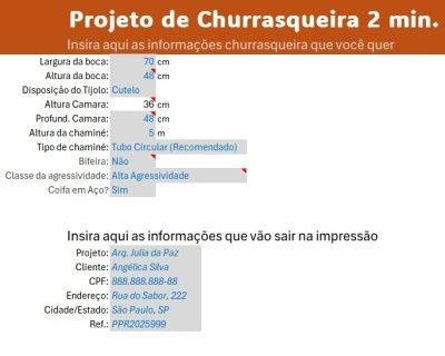 • Você informa as medidas da boca, o tipo de churrasqueira e as preferências do projeto em uma única aba.
